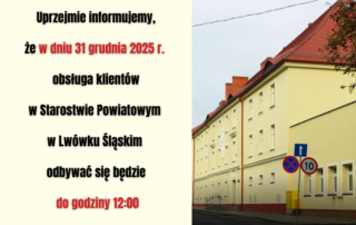 Uprzejmie informujemy, że w dniu 31 grudnia 2025 r. obsługa klientów w Starostwie Powiatowym w Lwówku Śląskim odbywać się będzie do godziny 12:00. Za niedogodności przepraszamy.